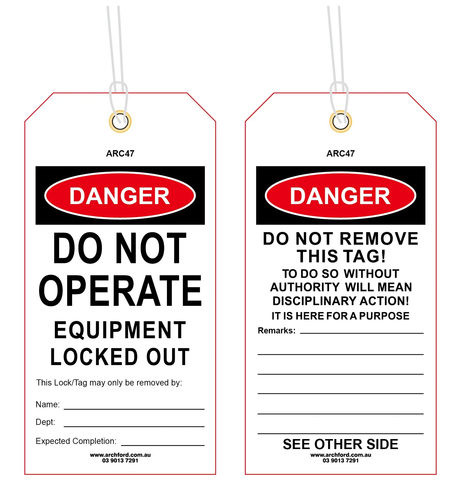 Equipment Locked Out Tearproof Tag Details: Size: 3.15" x 6.3" Color: Red/Black/White Finishing: 5/16"Brass eyelet and string Material: 10-mil Poly... Read more