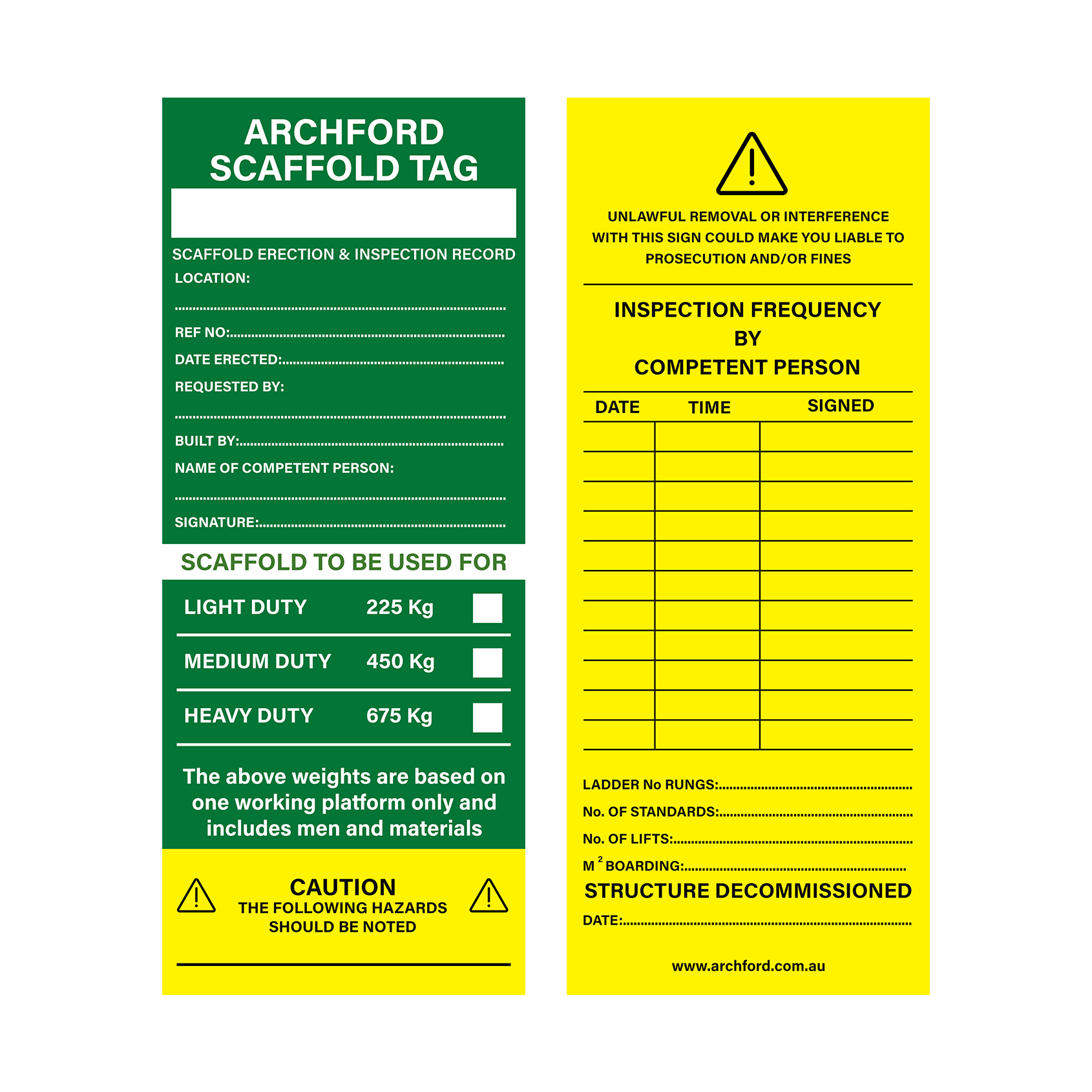 Archford Scaffold Tag Details: Scaffold Tag Pack: 20 Replacement Tags Tag Dimensions: 8.4" x 3.4" x 0.02" Tag Material: PVC Read more